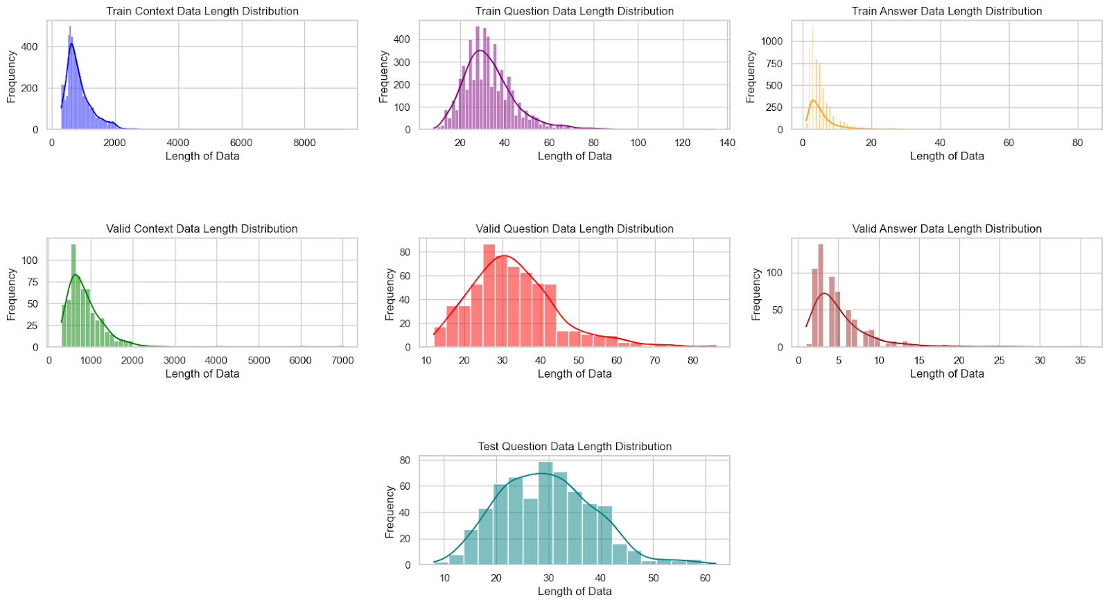 우선, 학습(train) 및 검증(validation) 데이터셋의 각 요소인 질문(question), 지문(context), 답변(answer)의 길이 분포를 분석했다. 각 데이터셋에서 이들 요소의 평균 길이, 최소 길이, 최대 길이를 계산하고, 전체 데이터에서 이상치(outlier)로 판단될 수 있는 극단적인 길이의 항목들을 파악했다. 이러한 분석은 질문과 지문, 답변의 길이가 모델 성능에 미치는 영향을 사전에 이해하고, 적절한 전처리 방법을 고려하기 위해 진행되었다.