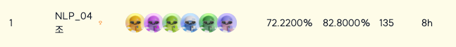 | 대회 제공 base | RoBERTa-large (fine-tuned by KorQuAD) | 69.5800 / 78.1500 |