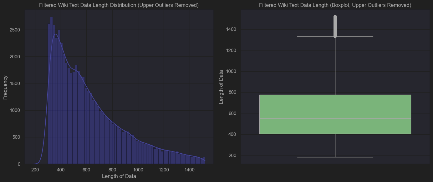 추가적으로, wikipedia.json 파일에 저장된 모든 지문의 길이 분포를 분석하고, 이 데이터가 학습 데이터셋으로 발췌되어 사용된 지문과 길이 면에서 얼마나 유사한지 비교했다. 이 비교를 통해 학습 데이터셋의 지문이 얼마나 균형 잡힌 분포를 가지고 있는지, 그리고 wikipedia 데이터와의 차이점이 있는지 파악할 수 있었다. 실제로 길이 분포를 그래프로 시각화해본 결과, 문서 하나당 46099자를 포함하는 상당한 아웃라이어가 관측되었다. 이러한 아웃라이어를 처리하기 위해 IQR(Interquartile Range)을 활용하여 상단 아웃라이어를 제거하였다.