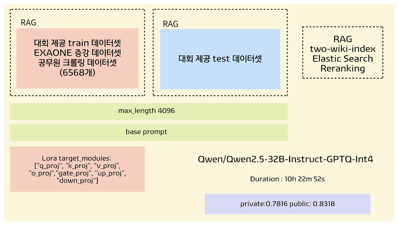 한정된 컴퓨팅 성능과 시간 내에서 더 큰 모델, 더 긴 입력 토큰, 더 많은 데이터를 사용하기 위해 시행착오를 겪었다. 가장 만족스러운 점은 하나에 매몰되지 않고 다양한 각도에서 시행착오를 겪었다는 점이다. 데이터 관점에서는 테스트 셋을 가장 잘 따르는 훈련 셋을 구축하기 위해 데이터 전처리 / LLM 기반 증강 / Hugging Face, 크롤링, PDF 파싱을 통한 외부 데이터 수집을 진행했다. 모델 관점에서는 경량화/양자화 등 다양한 메모리 최적화 기법을 시도했고, PEFT(LoRA)를 통해 하이퍼파라미터 튜닝으로 성능을 개선했다. 또한 RAG 도입과 Prompting 기법 활용 등 할 수 있는 방법은 전부 시도했다. 좋은 결과로 이어지지 않은 것들도 많았지만 다른 실험을 이어갈 수 있는 근거가 되었다.