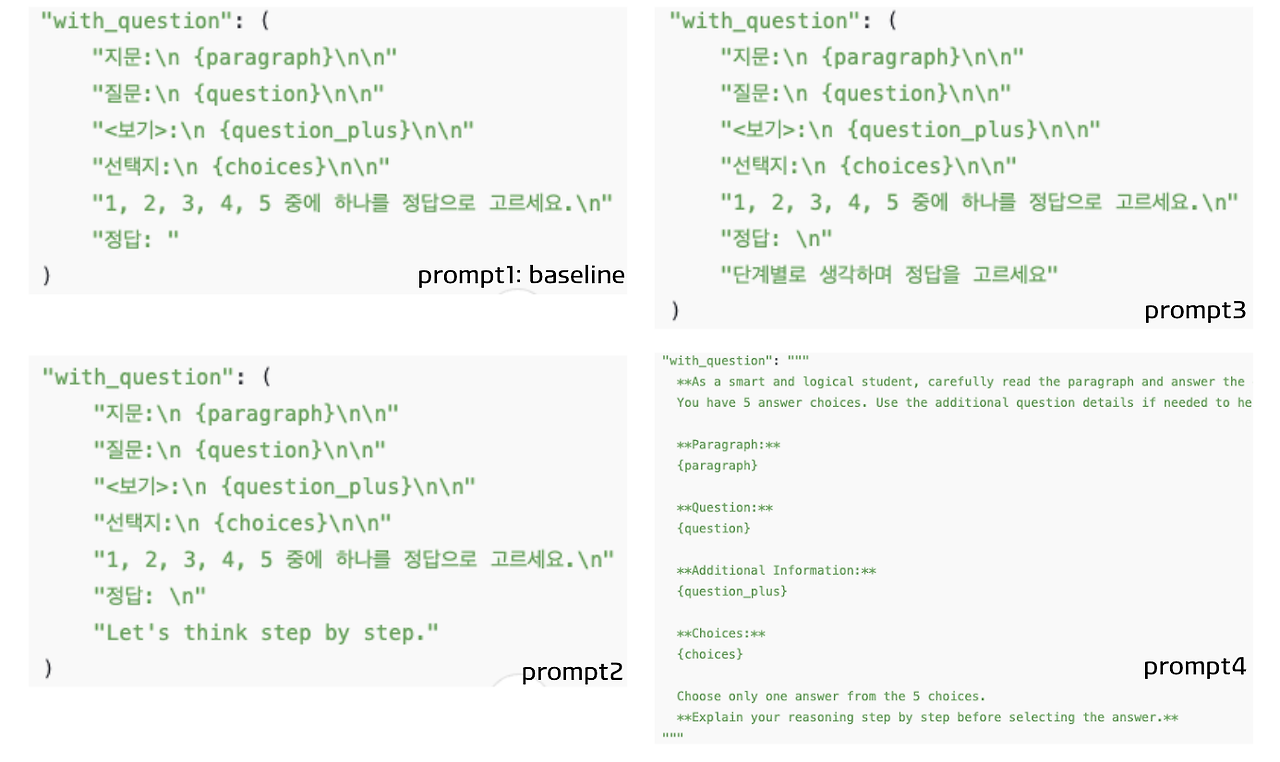 “수능 국어 1등급에 도전하는 AI”를 참고하여 다양한 프롬프트 실험을 진행하였다.