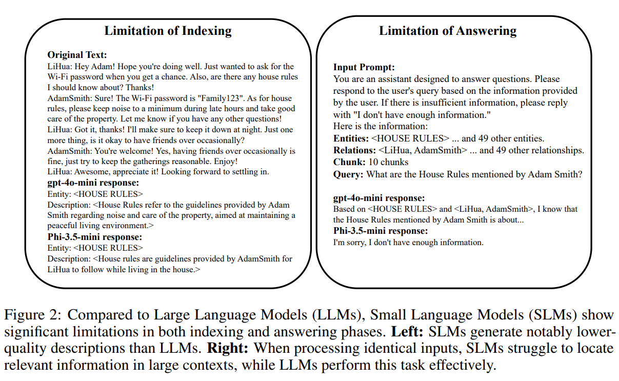 - SLM은 복잡한 의미 이해(Semantic Understanding)와 텍스트 처리 능력이 부족하여 기존의 정교한 RAG 파이프라인(LightRAG, GraphRAG 등)을 소화하지 못한다.